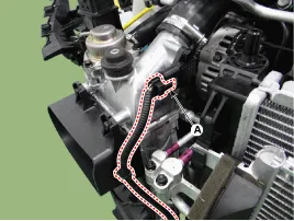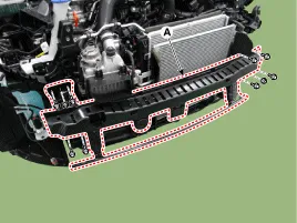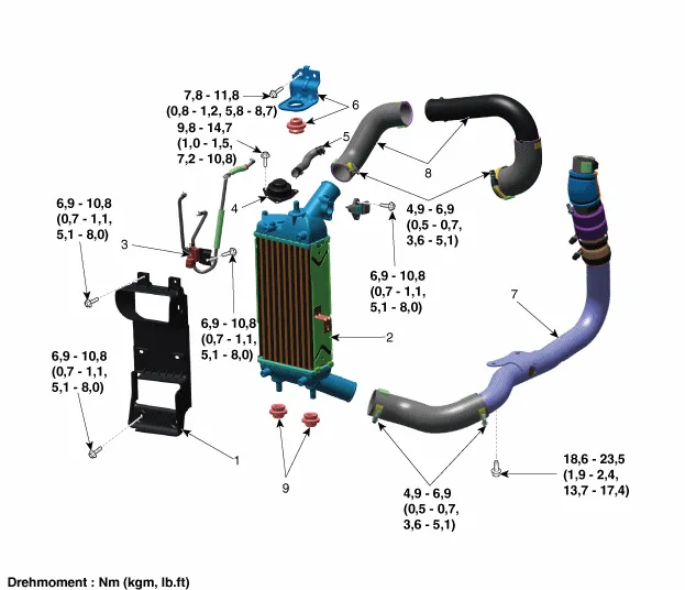 | 1. Ladeluftkühlerschutz 2. Ladeluftkuhler 3. Steuermagnetventil und Unterdruckschlauch Rückführventil (RCV) 4. Rückführventil (RCV) 5. Rückführventil (RCV)-Schlauch |