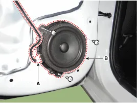 Steckverbinder (A) abziehen und Schrauben lösen, dann Vordertürlautsprecher (B) ausbauen.