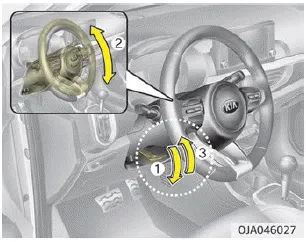 Um die Lenksäulenstellung zu verändern, ziehen Sie den Sicherungshebel (1) nach unten, bringen Sie das Lenkrad in den gewünschten Winkel (2) und klappen Sie danach den Sicherungshebel wieder nach oben, um die Lenksäule zu fixieren (3). Bringen Sie die Lenksäule immer vor Fahrtantritt in die gewünschte Stellung.