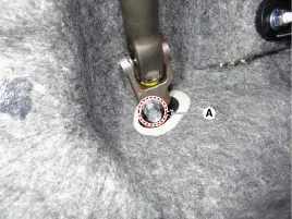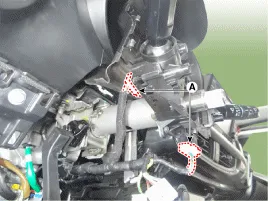Reparaturverfahren Ausbau 1. Kreuzgelenkschraube (A) entfernen. Anzugsdrehmoment: 32,4 ~ 37,5 Nm (3,3 ~ 3,8 kgm) • Leerlauf eingelegt lassen, damit der innere Seilzug der Wickelfeder beim Drehen des Lenkrads nicht beschädigt wird.