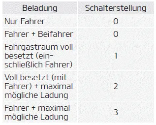 In der folgenden Tabelle sind Beispiele für ordnungsgemäße Schalterstellungen aufgeführt. Für Beladungszustände, die hier nicht aufgeführt sind, drehen Sie das Stellrad in eine Stellung, die einem aufgeführten Beispiel am nächsten kommt.