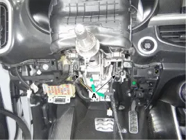 Reparaturverfahren Ausbau 1. Kreuzgelenkschraube (A) entfernen. Anzugsdrehmoment: 32,4 ~ 37,5 Nm (3,3 ~ 3,8 kgm) • Leerlauf eingelegt lassen, damit der innere Seilzug der Wickelfeder beim Drehen des Lenkrads nicht beschädigt wird.