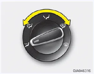 Der Modusschalter steuert die Richtung des Luftstroms im Belüftungssystem. Die Luft kann in den Fußraum, zu den Düsen im Armaturenbrett und zur Windschutzscheibe geleitet werden. Es werden fünf Symbole für die Lüftungsmodi Kopfbereich, Kopfbereich & Fußraum, nur Fußraum, Fußraum & Windschutzscheibe und Windschutzscheibe entfrosten verwendet.