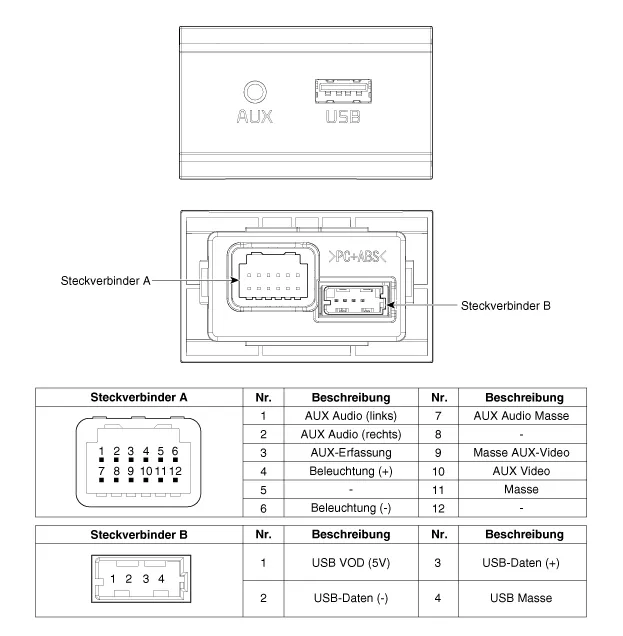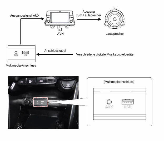 Der Multimedia-Anschluss an der oberen Konsolenabdeckung ist für Kunden gedacht, die Musik von externen, tragbaren Abspielgeräten wie MP3-Playern usw. über das Soundsystem der Audioanlage des Fahrzeugs hören möchten. In diesem Fahrzeug hat der Kunde die Möglichkeit dazu.