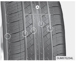 Bei gleichmäßigem Reifenverschleiß erscheint mit der Zeit eine Verschleißanzeige (A) über die Breite der Lauffläche. Sie zeigt an, dass die verbleibende Profiltiefe weniger als 1,6 mm beträgt. Ersetzen Sie den Reifen, sobald dies der Fall ist.