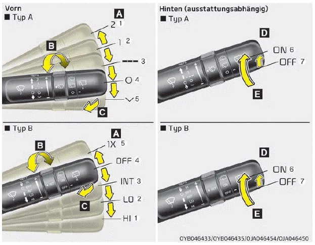 Bei eingeschalteter Zündung stehen folgende Funktionen zur Verfügung. 1 2/HI: Wischgeschwindigkeit schnell 2 1/LO: Wischgeschwindigkeit normal 3 ---/INT: Intervallwischen mit demselben Wischintervall.
