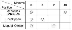 Klemmen entsprechend der folgenden Tabelle an Masse legen und prüfen, ob die Schiebedachbewegungen der Tabelle entsprechen.