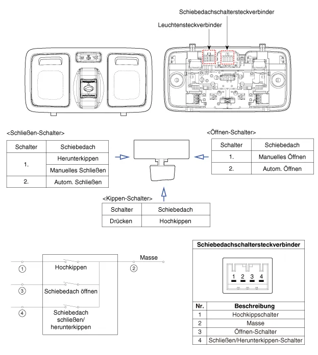 Bauteile und bauteile-Übersicht BAUTEILE-ÜBERSICHT 1. Schiebedach 2. Schiebedachschalter 3. Schiebedachmotor & Steuerung Schematische darstellungen Schaltplan