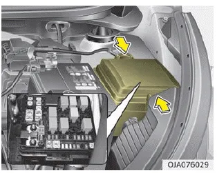 Verschließen Sie nach Arbeiten am Sicherungskasten im Motorraum den Deckel des Sicherungskastens sicher mit hörbarem Einrasten. Andernfalls kann Feuchtigkeit eindringen und elektrische Fehlfunktionen verursachen.