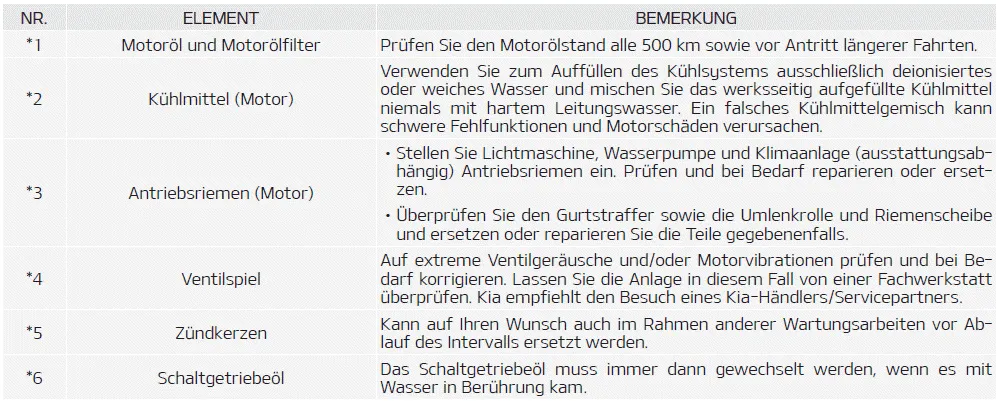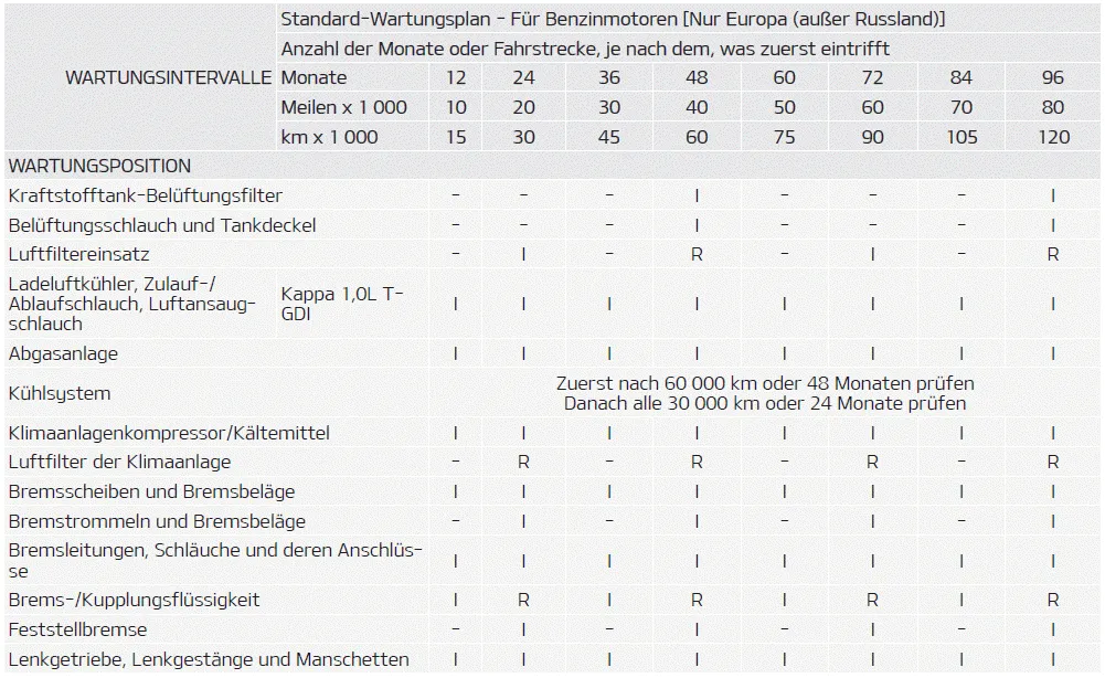 WARTUNGSART I: Prüfen und bei Bedarf einstellen, korrigieren, reinigen oder ersetzen.R: Ersetzen oder wechseln. ERSCHWERTE EINSATZBEDINGUNGEN A: Wiederholte kurze Strecken von weniger als 8 km bei normaler Temperatur oder weniger als 16 km bei Frosttemperatur.