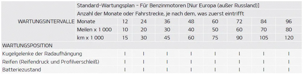 Die folgenden Wartungsarbeiten müssen durchgeführt werden, um die ordnungsgemäße Funktion der Abgasregelung und die Leistung sicherzustellen. Bewahren Sie die Nachweise aller Abgasuntersuchungen auf, um Ihre Garantie aufrechtzuerhalten. Sofern sowohl die Kilometeranzahl als auch die Zeit angezeigt werden, wird die Häufigkeit des Services dadurch bestimmt, was zuerst eintritt.