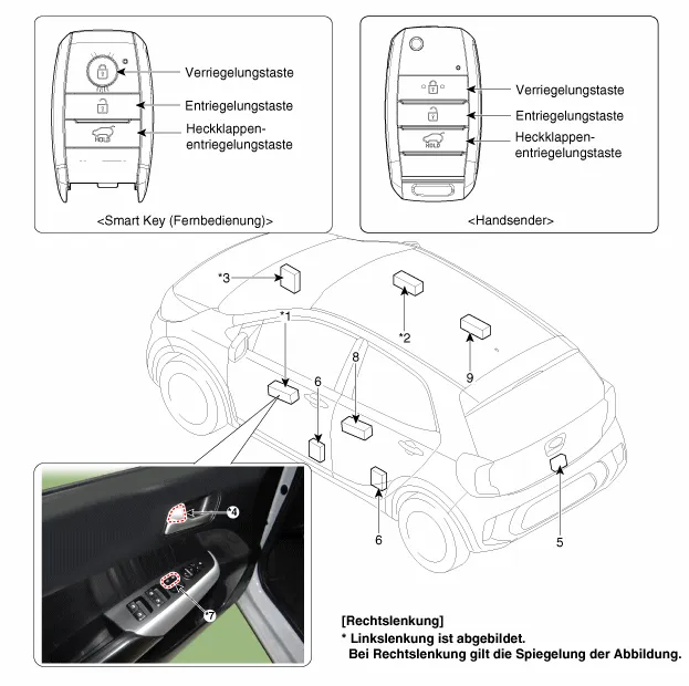2. Fensterheberschalter (Beifahrerseite) 3. Karosserie-Steuermodul (BCM) 4 . Türverriegelungsknopf 5 . Heckklappen-Stellantrieb |