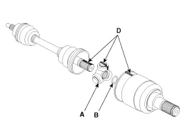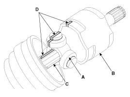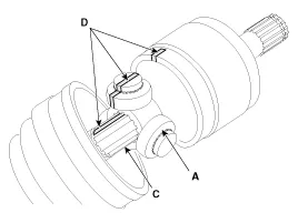 Markierungen (D) am Tripodegelenk (A), TJ-Gehäuse (B) und an der Längsverzahnung (C) anbringen, damit die Teile in ihrer ursprünglichen Lage wieder zusammengebaut werden können.
