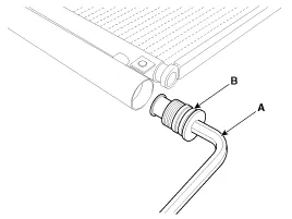 Trocknungsmittel (A) mithilfe einer Spitzzange aus dem Kondensator entfernen. Auf zerkrümeltes Trocknungsmittel und verstopften BodendeckeÖlfilter prüfen.