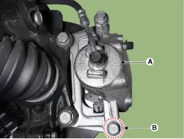 Die Schraube (B) der Führungsstange lösen und den Bremssattel (A) nach oben aus dem Weg schwenken.