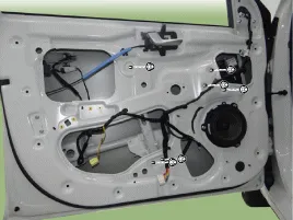 Befestigungsmuttern des Vordertürfensterheberreglers lösen.