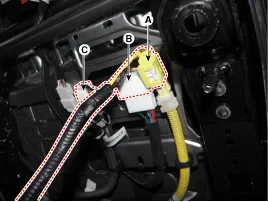 Steckverbinder von Airbag (A), Sitzheizung (B) und Vordersitzgurtschloss (C) abziehen. [FAHRERSEITE]