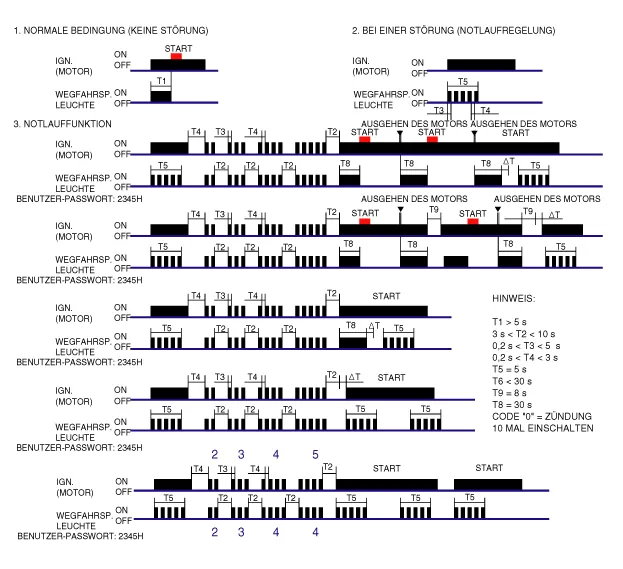 Verfahren zum Anlernen des 4-stelligen Benutzer-Passcodes Das Benutzerpasswort für begrenzte Aufhebung wird in der Kundendienstwerkstätte programmiert. Der Fahrzeugeigentümer kann eine vierstellige Nummer wählen. Die Programmierung des Benutzer-Passcodes ist nur für ein "angelerntes" PCM (ECM) möglich. Vor dem ersten Anlernen des Benutzer-Passcodes ist der Status des PCM (ECM) 'unprogrammiert'. Die Limp Home-Funktion kann nicht angewendet werden. Das Verfahren beginnt damit, dass die Zündung mit einem gültigen Transponderschlüssel (programmierter Schlüssel) eingeschaltet wird und dass der Benutzer-Passcode über das Diagnosegerät gesendet wird. Nach erfolgreicher erster Anlernprozedur des Benutzer-Passcodes ändert sich der Status von 'unprogrammiert' nach 'angelernt'. Ein angelernter Passcode kann auch wieder geändert werden. Dies ist möglich, solange der Status "Angelernt" lautet. Um die Zugangsberechtigung zu erhalten, mit dem Diagnosegerät entweder den alten Passcode oder die spezifischen Fahrzeugdaten an das ECM senden. Wenn die Zugangsberechtigung erkannt wurde, forder das PCM (ECM) den neuen Passcode an. Danach bleibt der Status "Angelernt" bestehen und der neue Benutzer-Passcode ist gültig. Wenn 3-mal hintereinander oder kurzzeitig unterbrochen ein falscher Benutzer-Passcode oder falsche fahrzeugspezifischen Daten an das PCM (ECM) übertragen werden, sperrt das PCM (ECM) die Anfrage nach Änderung des Passcodes für 1 Stunde. Diese Zeitspanne kann weder durch Abklemmen der Batterie noch durch eine andere Manipulation verkürzt werden. Nach dem Wiederanschließen der Batterie beginnt der Zeitgeber die Stunde von neuem.