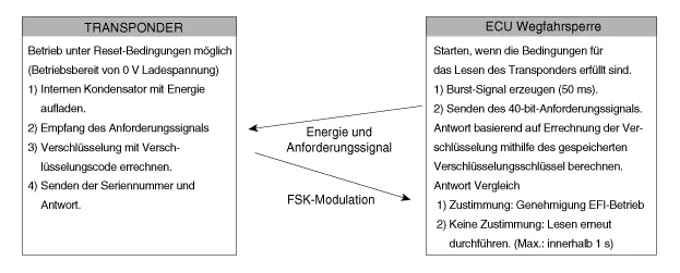 Das von der Antennenspule empfangene Funksignal wird von der Wegfahrsperren-Einheit in Meldungen für die serielle Kommunikation umgewandelt. Die vom PCM (ECM) empfangenen Meldungen werden in ein Funksignal umgewandelt, das über die Antenne zum Transponder übertragen wird.