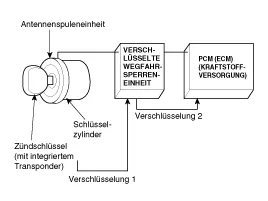 Die Kommunikation mit der Wegfahrsperre erfolgt über den in den Schlüssel eingebauten Transponder. Die drahtlose Kommunikation läuft auf RF (Funkfrequenz von 125 kHz). Die Wegfahrsperre ist hinter dem Armaturenbrett in der Nähe des Querträgers montiert.