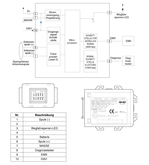 Die WEGFAHRSPERRE führt keine Gültigkeitsprüfung durch und berechnet auch nicht den Verschlüsselungsalgorithmus. Diese Vorrichtung ist nur eine Schnittstelle, die die empfangenen Transpondersignale in serielle Daten zum PCM (ECM) und umgekehrt umwandelt.