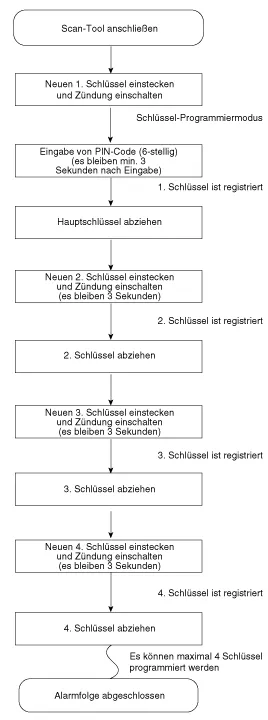 Das Anlernen der Schlüssel entspricht der Vorgehensweise für ein unprogrammiertes PCM (ECM). Die fahrzeugspezifischen Daten müssen aufgrund der eindeutigen Programmierung des Transponders unverändert werden. Wenn Daten geändert werden sollen, müssen neue Schlüssel mit einem noch nicht programmierten Transponder verwendet werden.