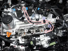 Befestigungsschrauben (B) lösen und dann Hochdruckkraftstoffleitung (C) ausbauen.