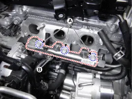Befestigungsschrauben (A) lösen und dann die Förderleitungs- und die Einspritzventileinheit (B) aus dem Motor ausbauen.